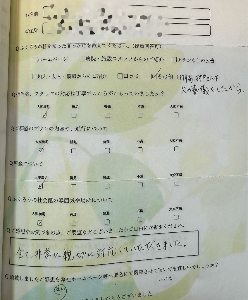 ふくろうの杜をご利用のお客様より、嬉しいお声をいただきましたのでご紹介いたします。