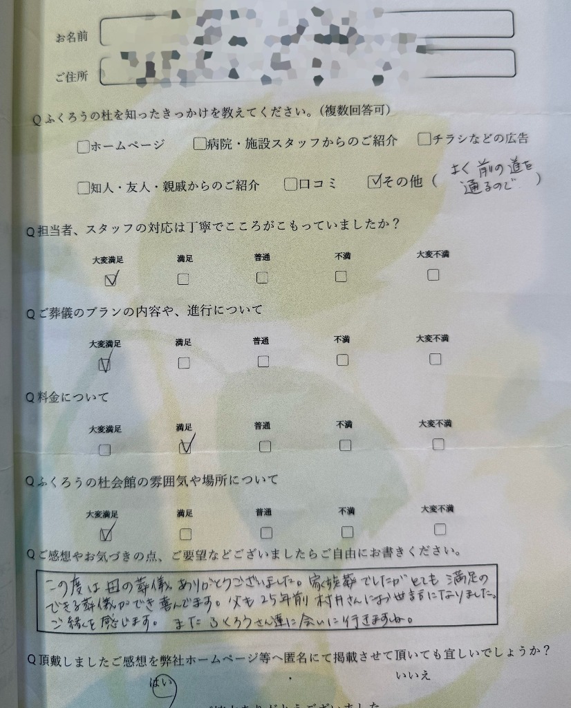 ふくろうの杜をご利用のお客様より、嬉しいお声をいただきましたのでご紹介いたします。