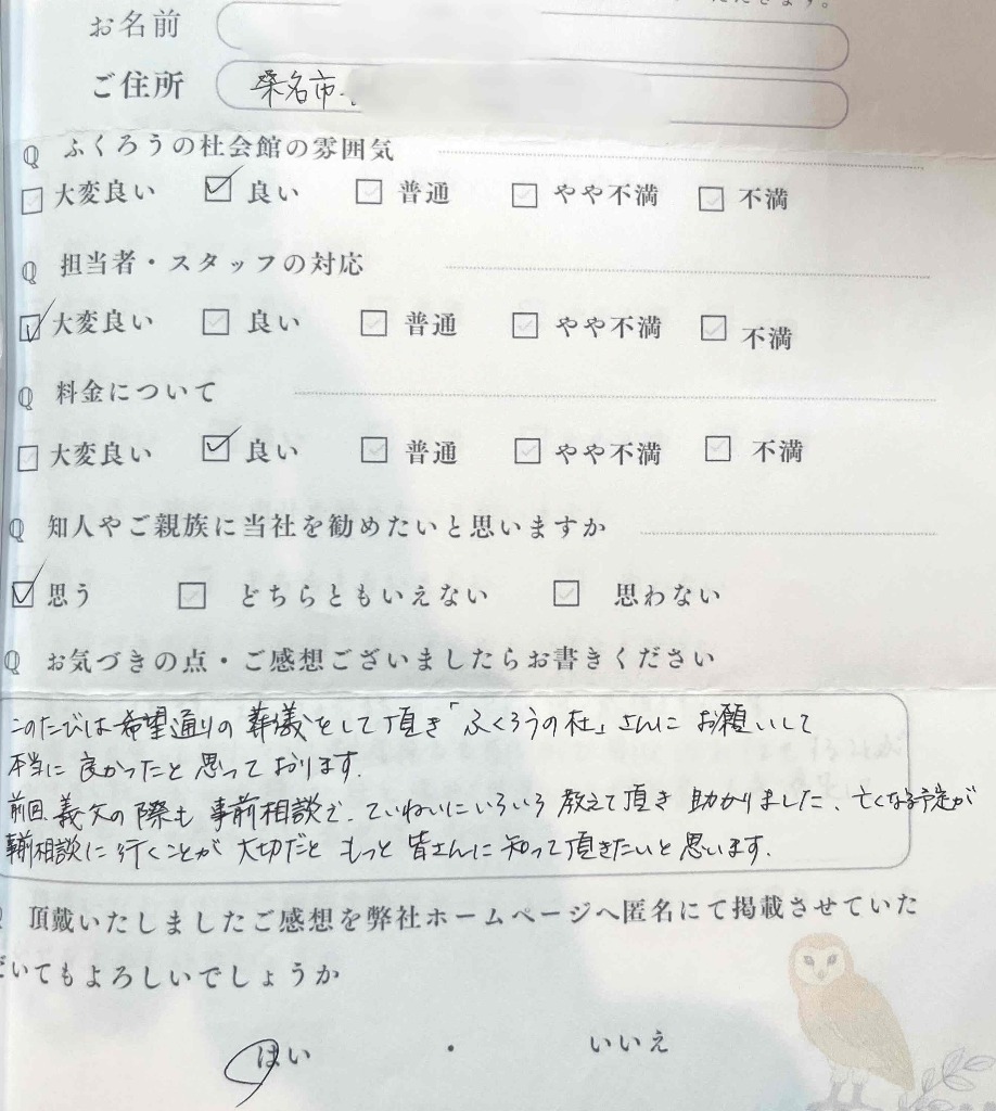 お客様の声(桑名市在住 ご利用式場:ふくろうの杜)
