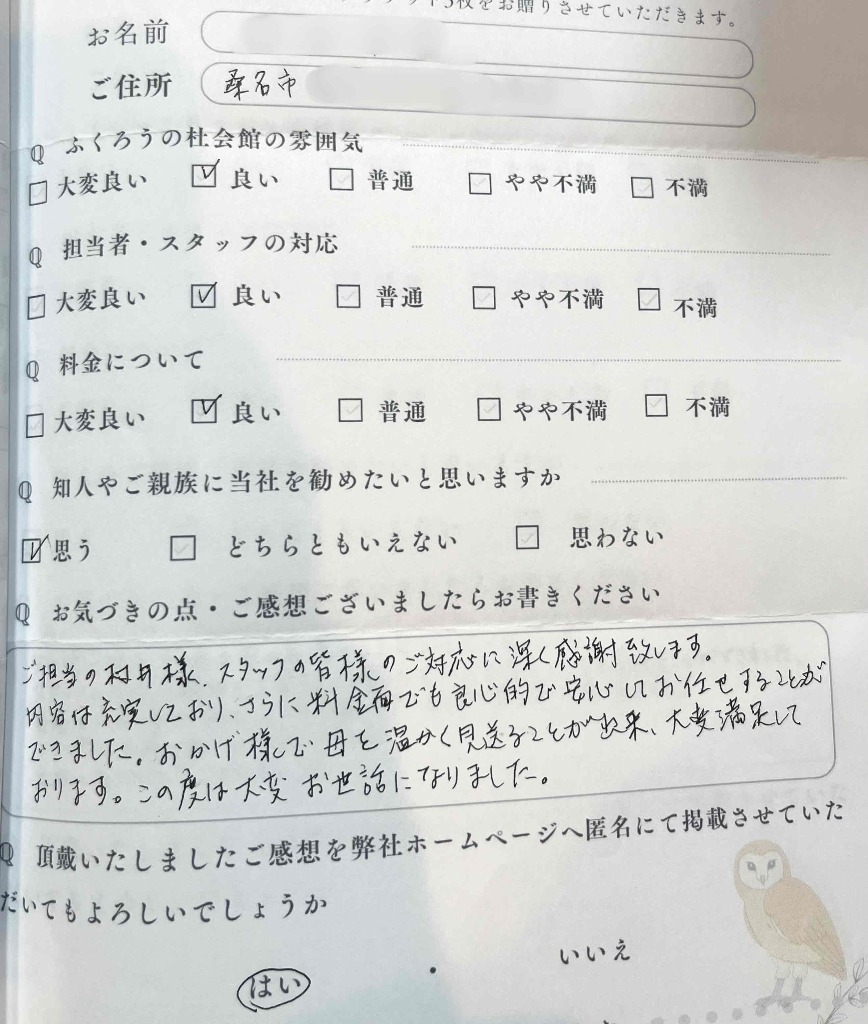 【このたびは希望通りの葬儀をして頂き「ふくろうの杜」さんにお願いして本当に良かったと思っております。