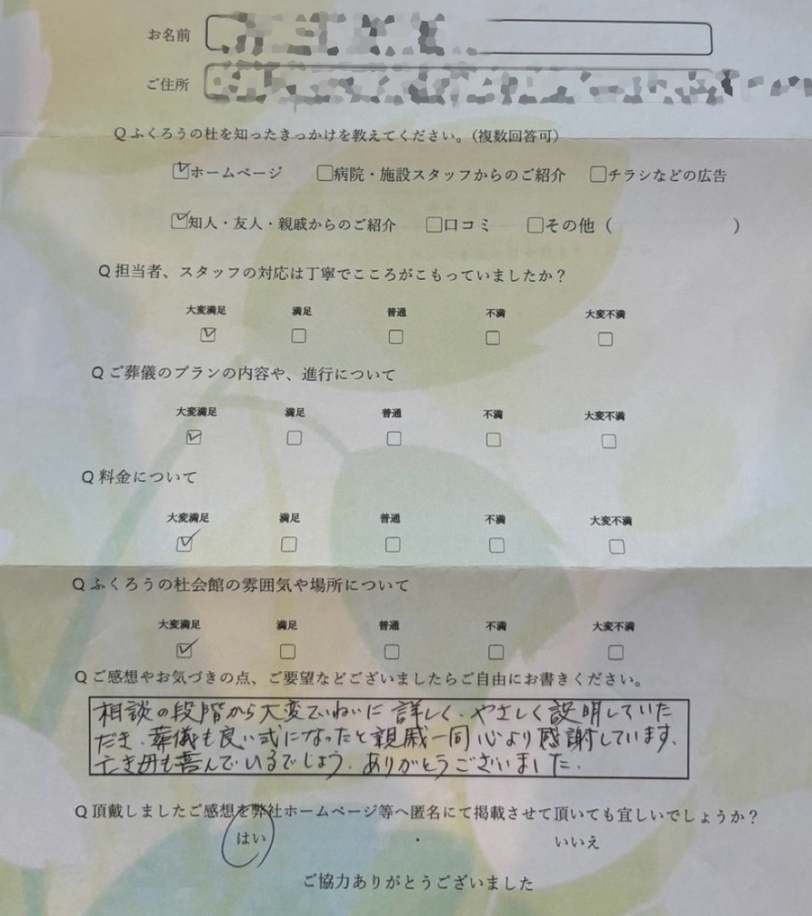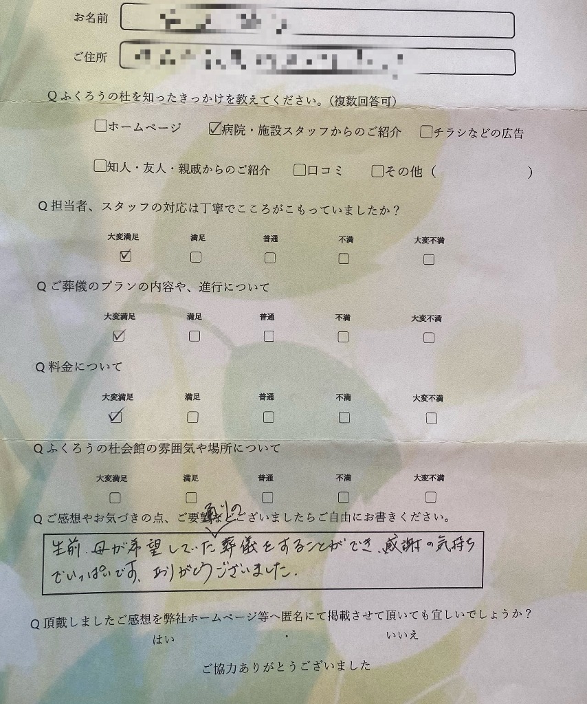 【生前、母が希望していた通りの葬儀をすることができ、感謝の気持ちでいっぱいです。ありがとうございました。】