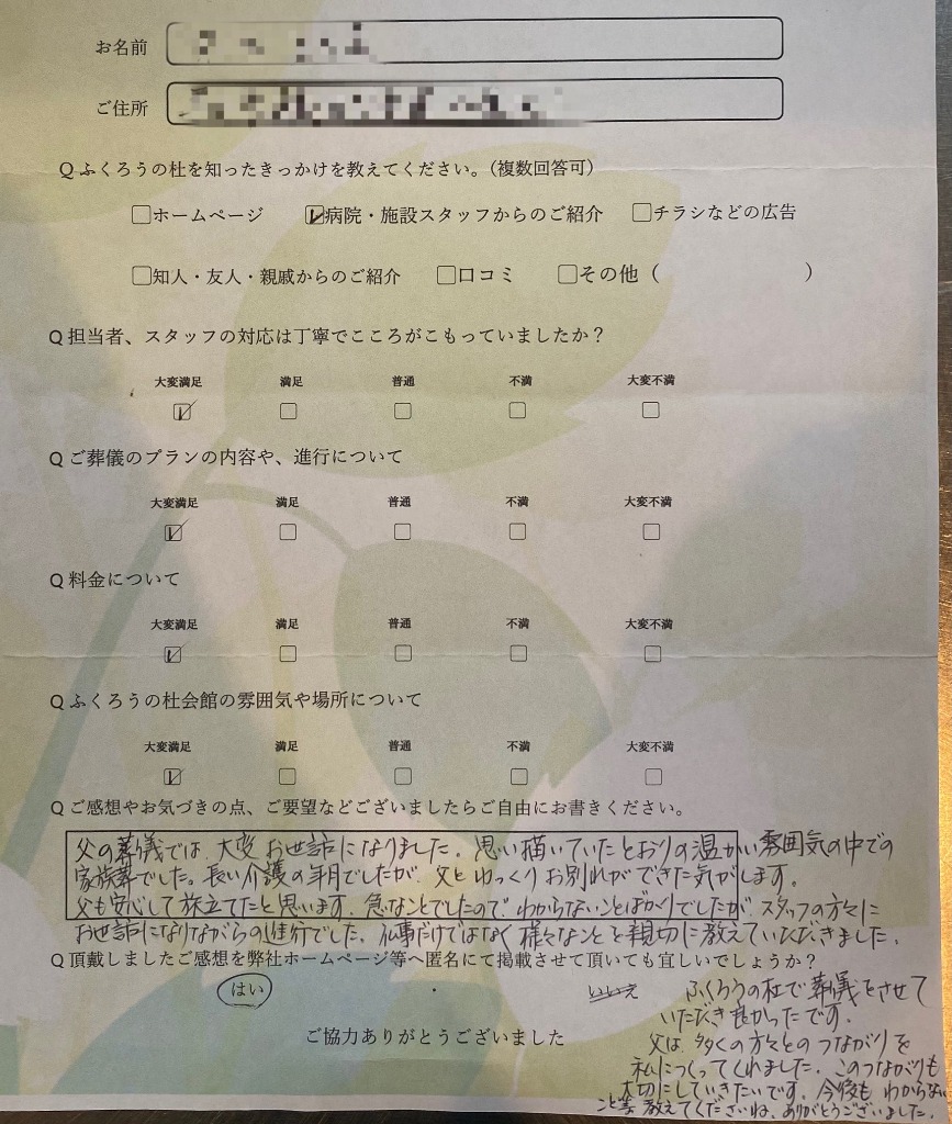 【父の葬儀では大変お世話になりました。思い描いていたとおりの温かい雰囲気の中での葬儀でした。長い介護の年月でしたが、父とゆっくりお別れができた気がします。父も安心して旅立てたと思います。急なことでしたので、わからないことばかりでしたが、スタッフの方々にお世話になりながらの進行でした。仏事だけでなく、様々なことを親切に教えていただきました。ふくろうの杜で葬儀をさせていただき良かったです。父は多くの方々とのつながりを私につくってくれました。このつながり大切にしていきたいです。今後もわからないことを教えてくださいね。ありがとうございました。】