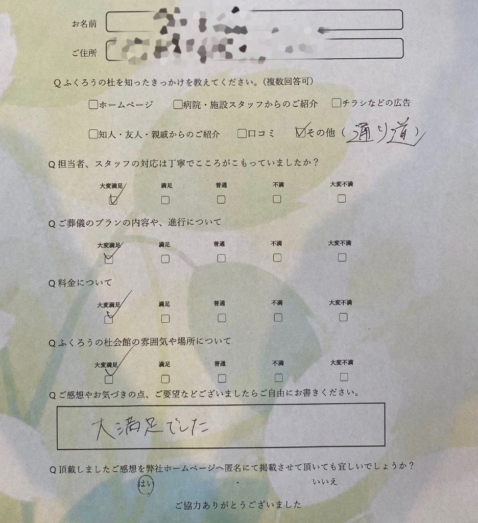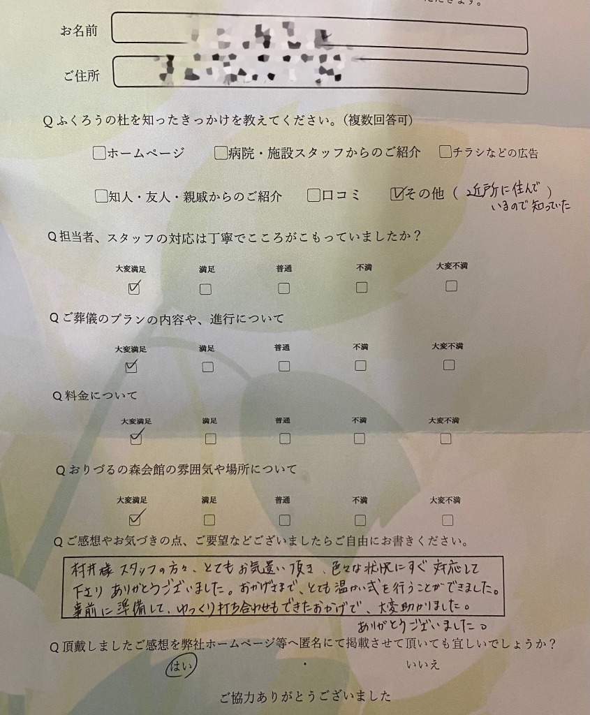ふくろうの杜をご利用のお客様より、嬉しいお声をいただきましたのでご紹介いたします。
