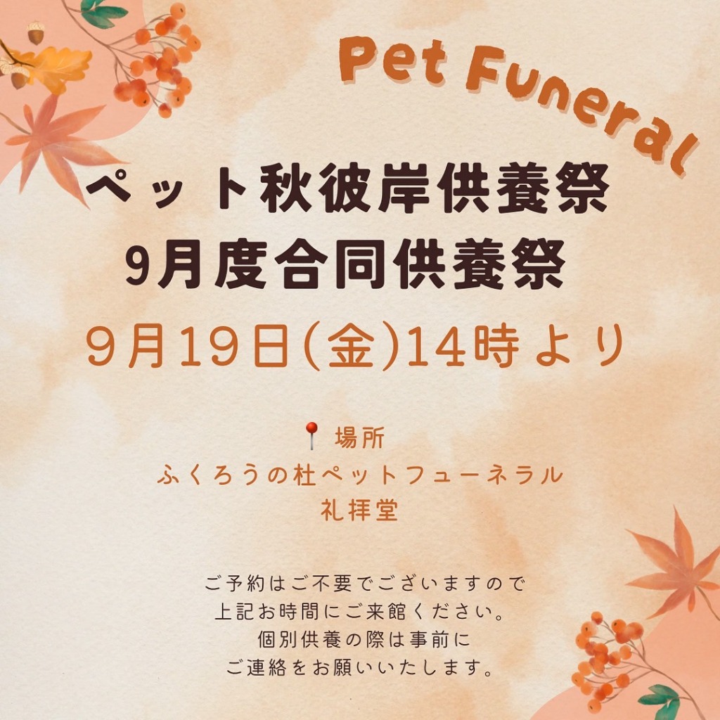 Pet Funeral並びにペット永代樹木葬秋彼岸合同供養祭日時のご案内です。