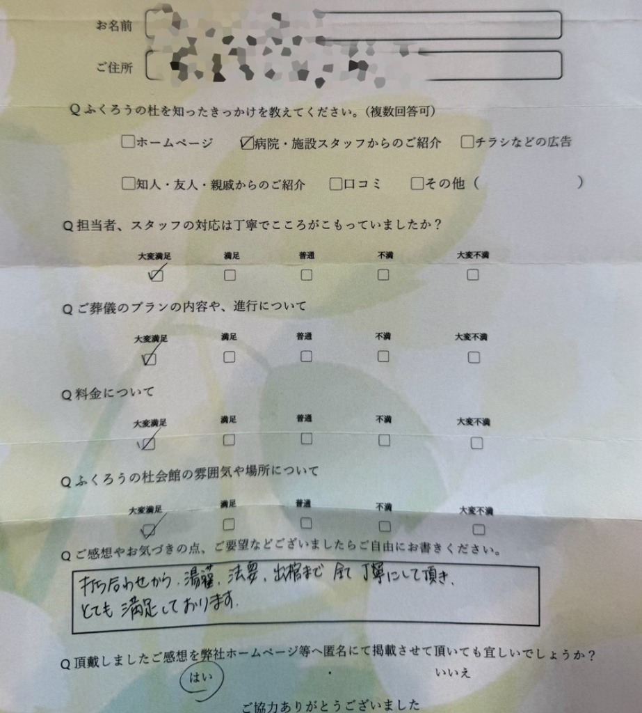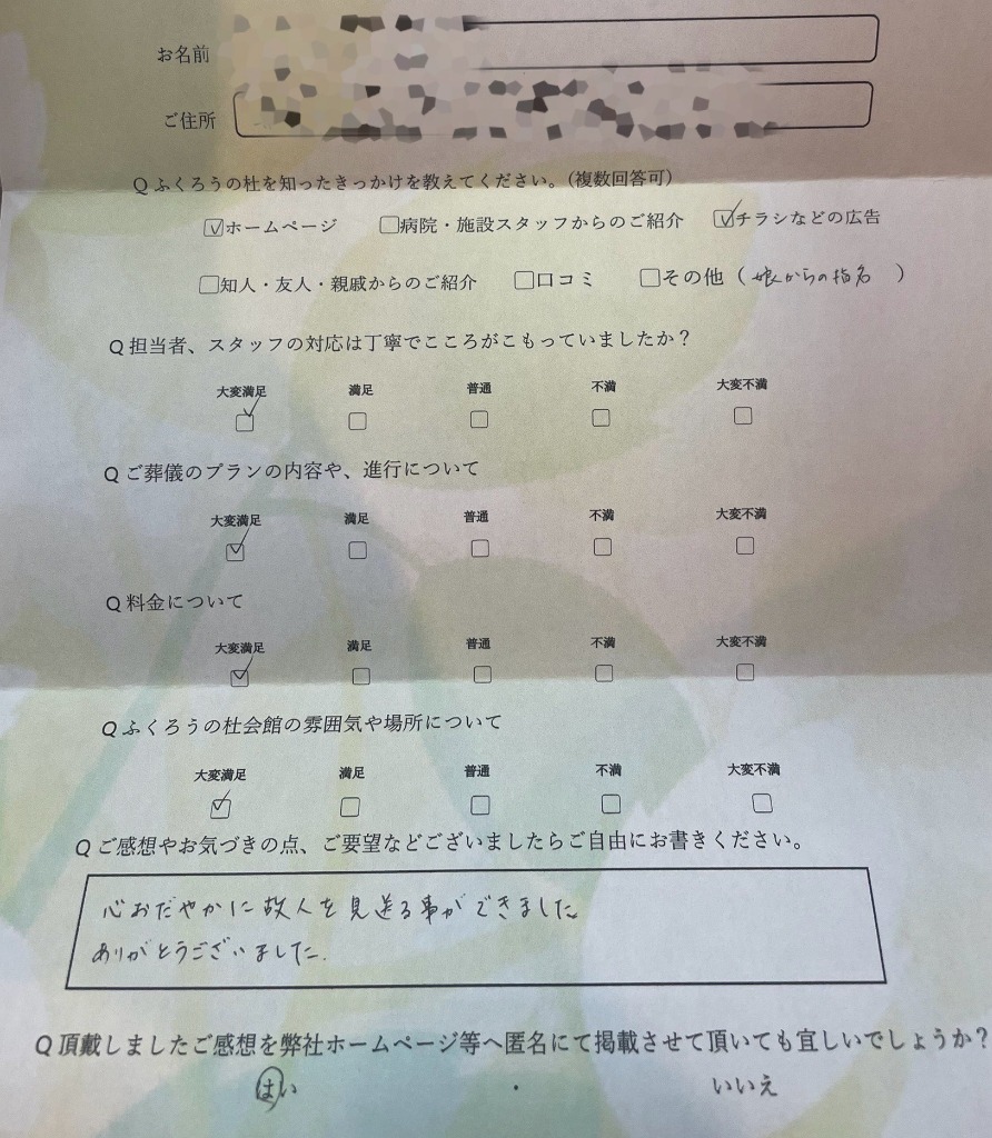 【心おだやかに故人を見送る事ができました。ありがとうございました。】