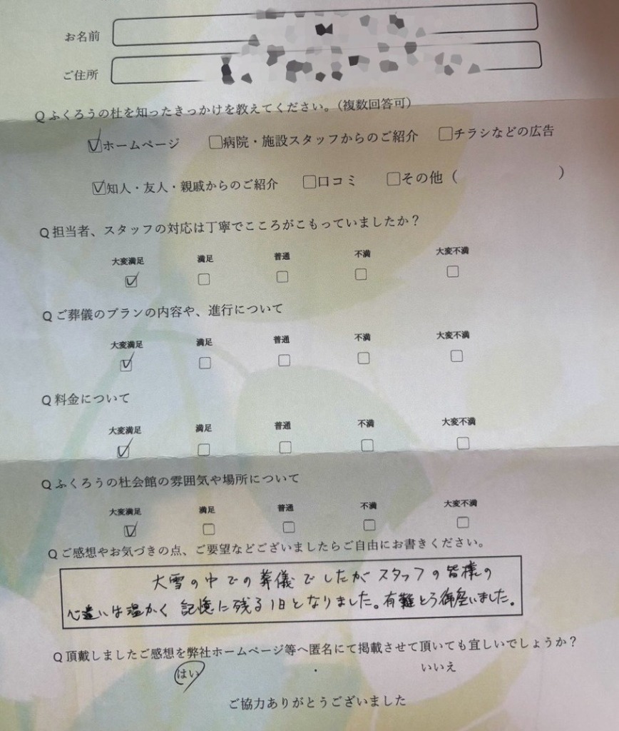 【大雪の中での葬儀でしたが、スタッフの皆様の心遣いは温かく記憶に残る1日となりました。有難う御座いました。】