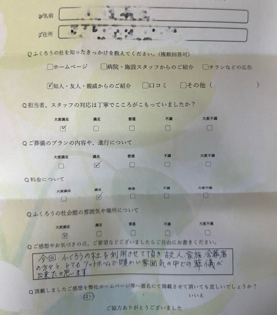 【今回、ふくろうの杜を利用させて頂き故人.家族.会葬者の方々と、とてもアットホームで暖かい雰囲気の中での葬儀が出来たと思います。】